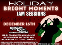 Celebrate the season with your favorite festive classics at our Holiday Jam Session! Obasi Akoto and prominent members of the Greater Baltimore & Washington, D.C. Jazz Community will lead us in world-class performances almost every Tuesday, 7-10pm. Surround yourself with great company, soul lifting music, and wonderful food! Click HERE to read our Bright Moments Jam Session Newsletter, written by Obasi Akoto every week.