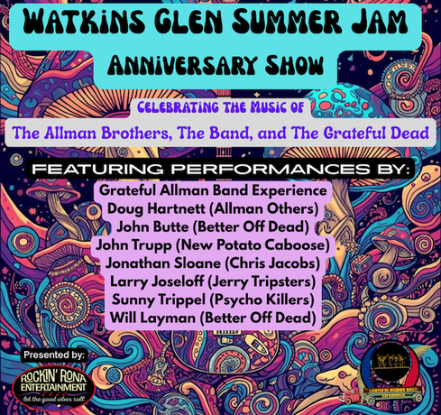 Watkins Glenn Summer Jam Anniversary Show is the best jam band concert in the area celebrating the music of The Allman Brothers, The Band, and The Grateful Dead featuring Grateful Allman Band Experience with Doug Hartnett (Allman Others), John Butte (Better Off Dead), John Trupp (New Potato Caboose), Jonathan Sloane (Chris Jacobs), Larry Joseloff (Jerry Tripsters), Sunny Trippel (Psycho Killers) and Will Layman (Better Off Dead) presented by Rockin' Rona Entertainment with the spacious dance floor open to groove all evening at our fabulous venue!
