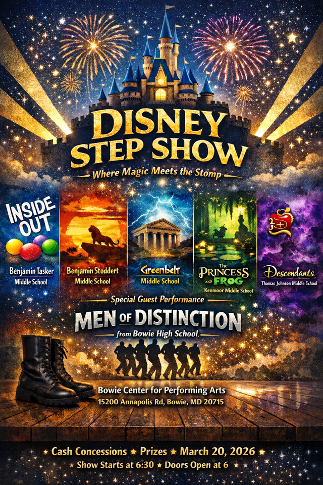 Experience a high-energy night where Disney stories come to life through step! Middle school step teams will perform routines inspired by Inside Out, The Lion King, Hercules, The Princess and the Frog, and Descendants, blending rhythm, movement, and storytelling into an unforgettable show for all ages.