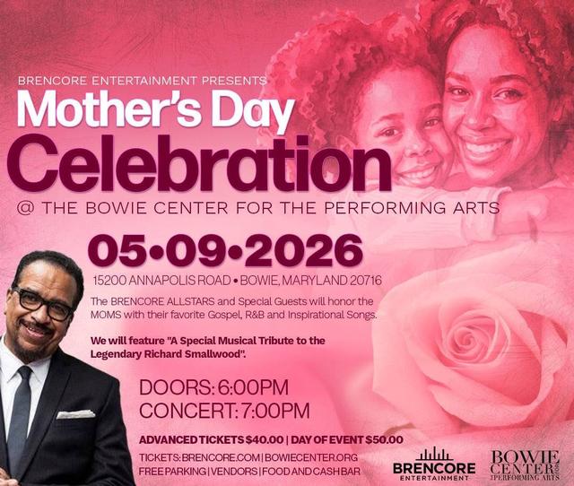 Saturday, May 9th - BRENCORE Entertainment and The Bowie Center for the Performing Arts Presents "A Mother's Day Celebration". The BRENCORE ALLSTARS and Special Guest will be honoring Moms with their favorite Gospel, R&B and Inspirational songs. Please bring your moms out so they can enjoy a great evening of music. We are dedicating this concert to the legacy and life of Richard Smallwood.
