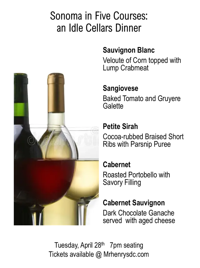 Join us for an evening featuring exceptional wines from Idle Cellars, each thoughtfully paired with a curated course. You will experience the wines, the food, and lively conversation and repartee with felow wine lovers.