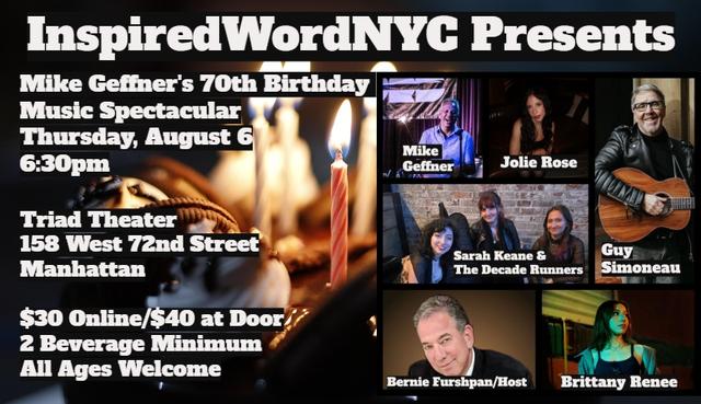 Mike Geffner’s Inspired Word, one of New York City’s most popular indie performance series, presents Mike’s 70th birthday Music Spectacular.