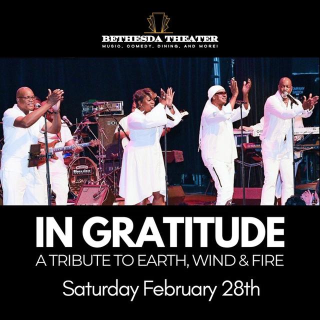 In Gratitude pays tribute to the legendary band Earth, Wind & Fire by performing their most popular songs with remarkable precision capturing the dynamic sound, fabulous harmonies and exciting stage show. This outstanding musical ensemble has a dozen talented performers including four lead vocalists, horn section, rhythm section, keyboards and percussion. Dance floor is open for an old school party featuring classic hits "Shining Star", "September", "Let's Groove", "Boogie Wonderland", "Reasons" and many more while also honoring the music of Stevie Wonder and Sly Stone!